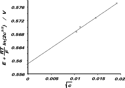 We plot a graph of E + {RT/F}ln{2c3/2} against c1/2, and extrapolate to find the ordinate intercept (ie. a value for E0cell). The cell emf when aCd2+ = aCl- = 1 corresponds to Ecell.