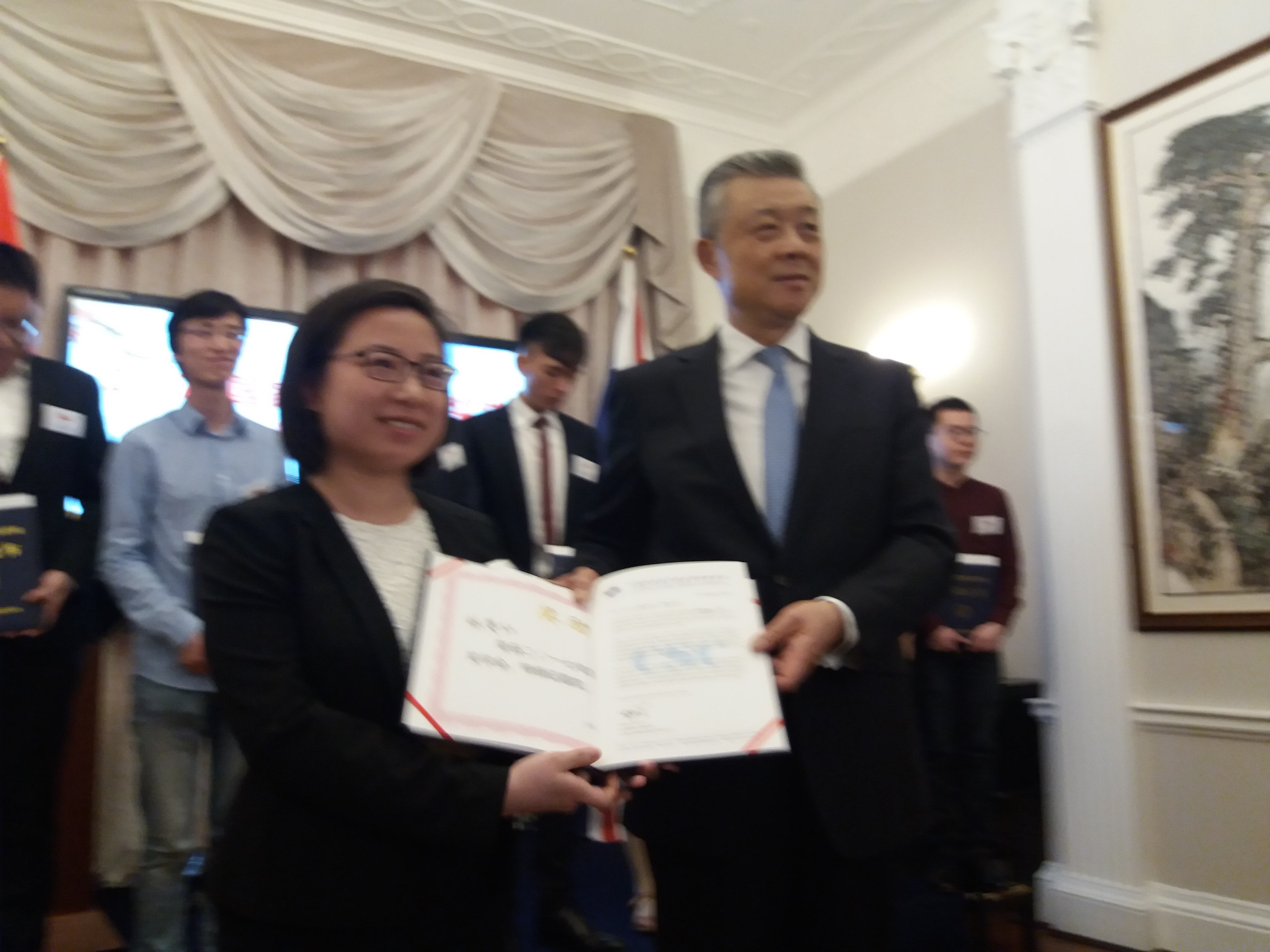 of this prestigious competition. Chuhong Lin was presented with a certificate (and cheque) by the Ambassador Liu Xiaoming.