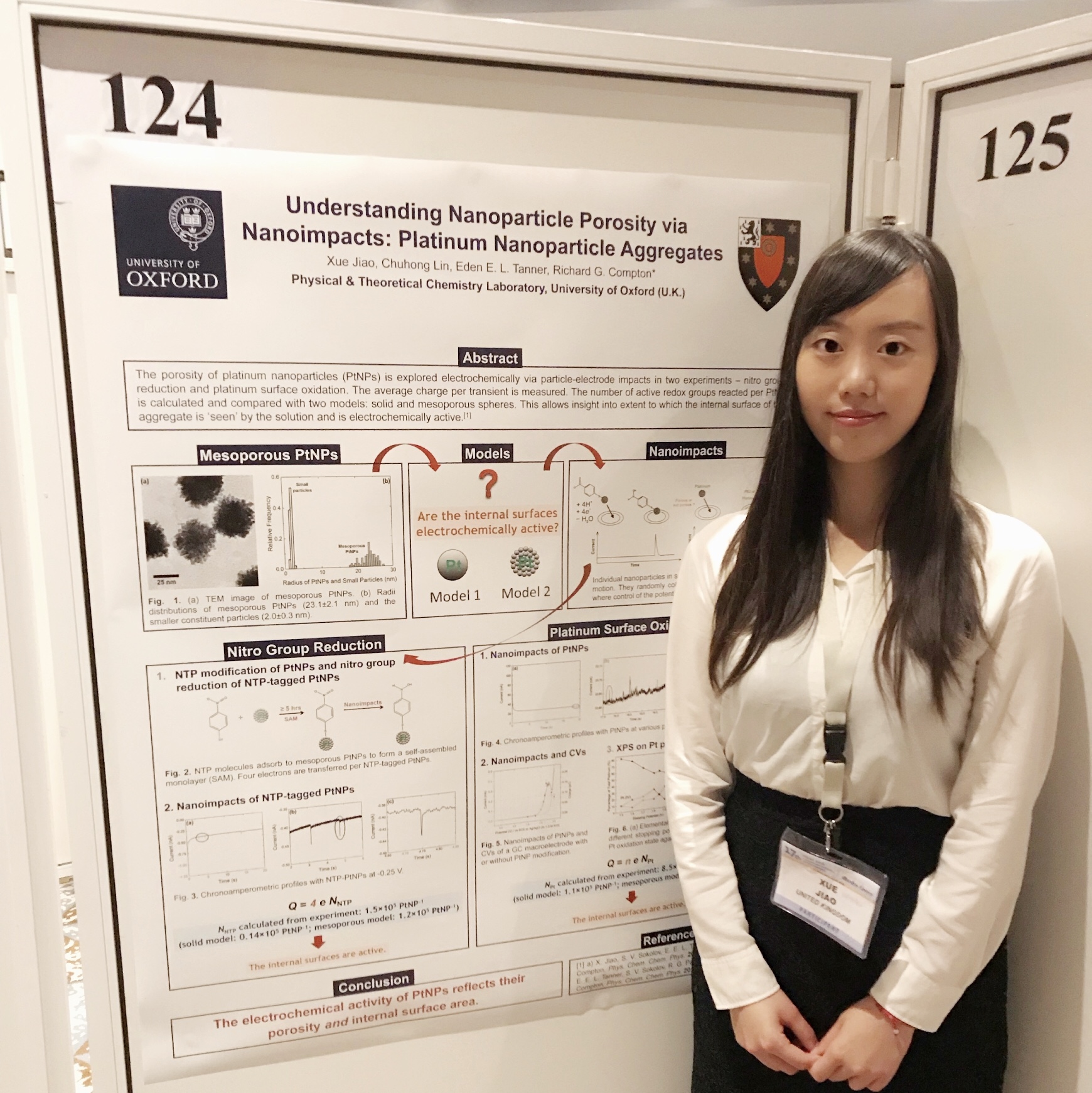 Xue Jiao ('Crystal') has won the Best Poster Prize at the European Society for Electroanalytical Chemistry (ESEAC) 2018 meeting held in Rodos, Greece between June 3rd and 7th. The prize is sponsored by the international journal Electroanalysis published by Wiley. Crystal's poster showed how nanoparticle porosity can influence their electro-catalytic properties using Platinum particles as an illustration. her work demonstrates unambiguously that the internal surfaces are electrochemically active. Crystal is shown with her poster and with Profa. Dra Denise Lowinsohn (Brasil), former group member.