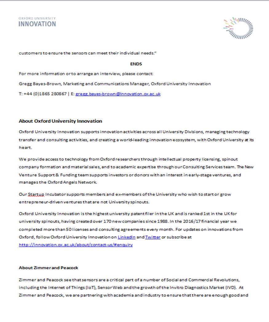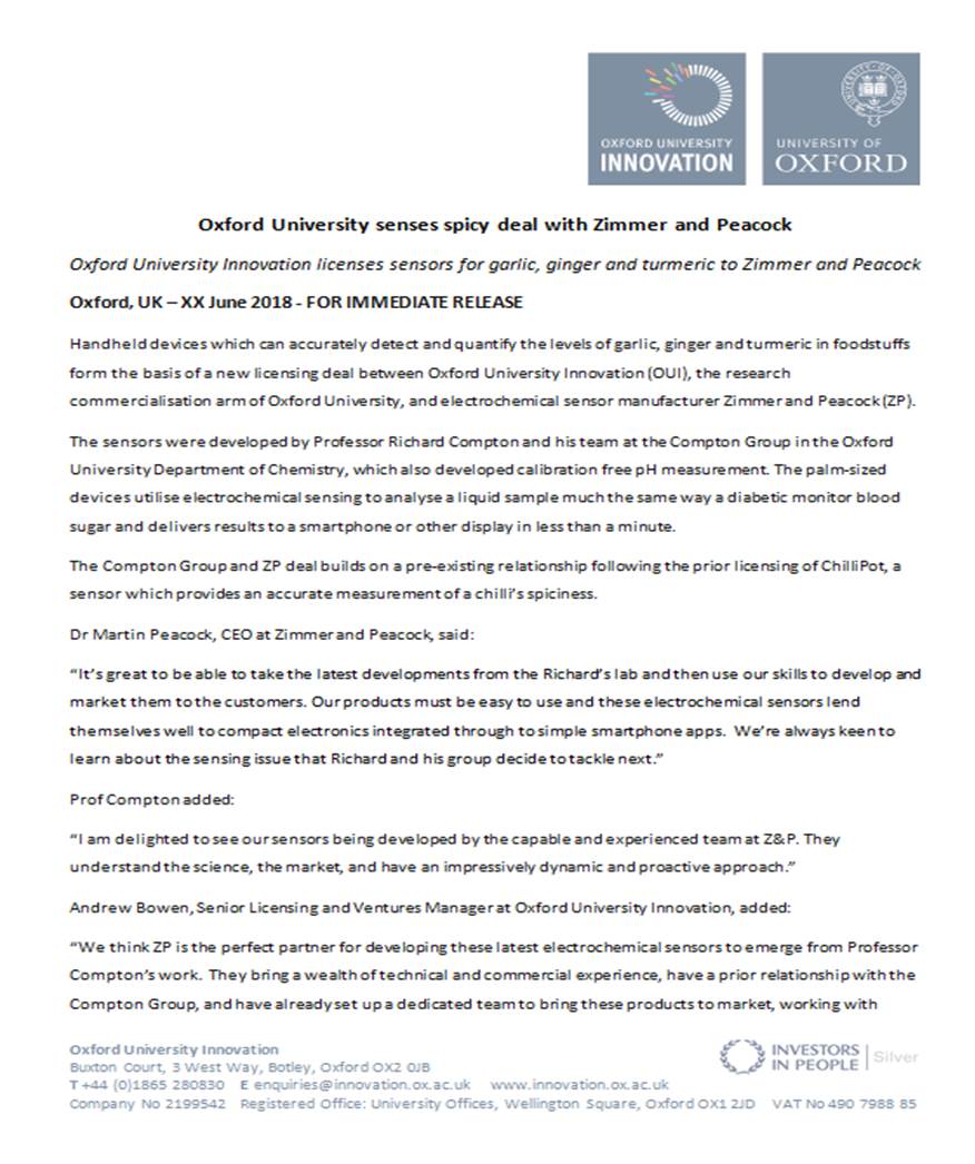 Oxford University Innovation has licensed the Compton Group sensors for garlic, ginger and turmeric to Zimmer and Peacock.